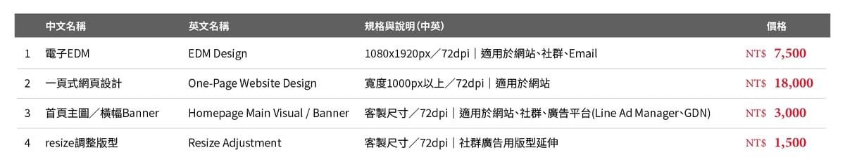 1. 以上報價不含5%營業稅,報價可能會依照製作尺寸、撰寫文案與複雜程度不同而有所調整,以實際報價單為準。